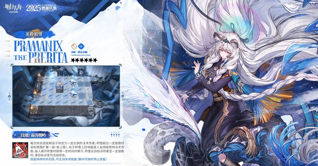 攻击范围内的地面会周期性产生一层积雪,地面敌人经过时立即受到相当于攻击力一定比例的法术伤害,每层积雪使经过的所有敌人移动速度降低,最多叠加数层(首个敌人离开该地块时积雪消失)