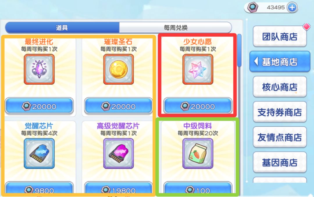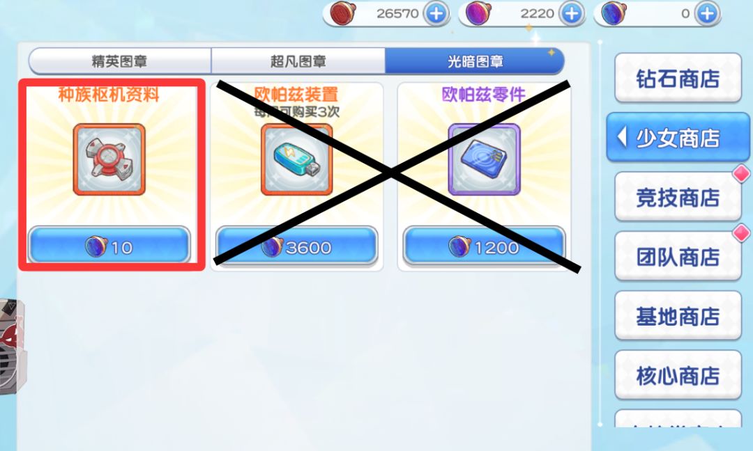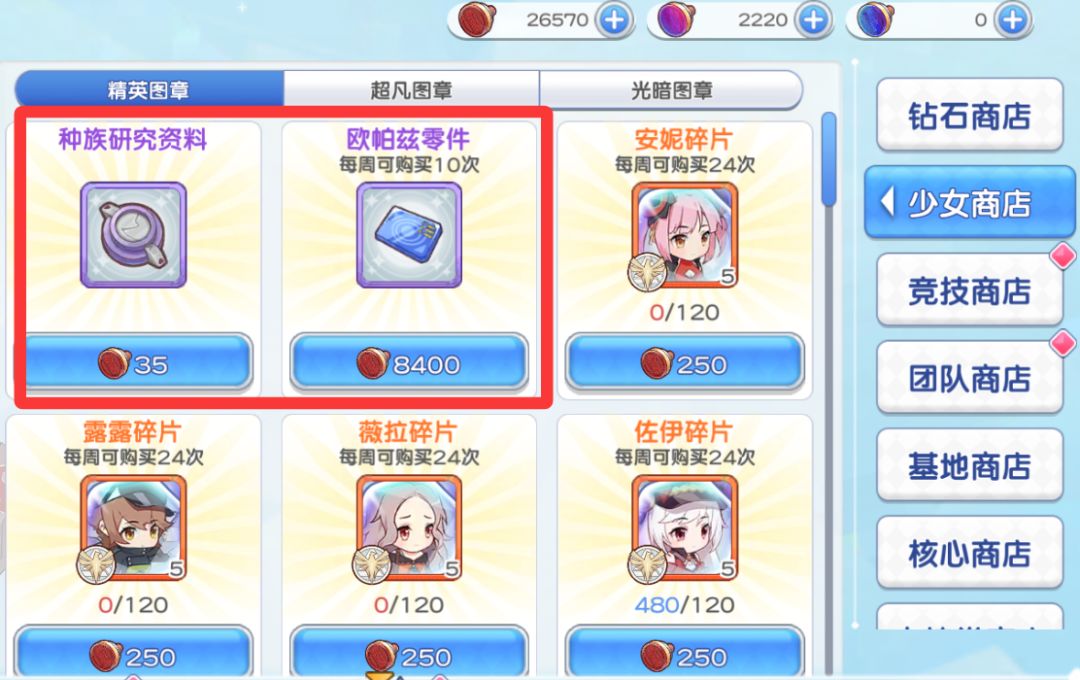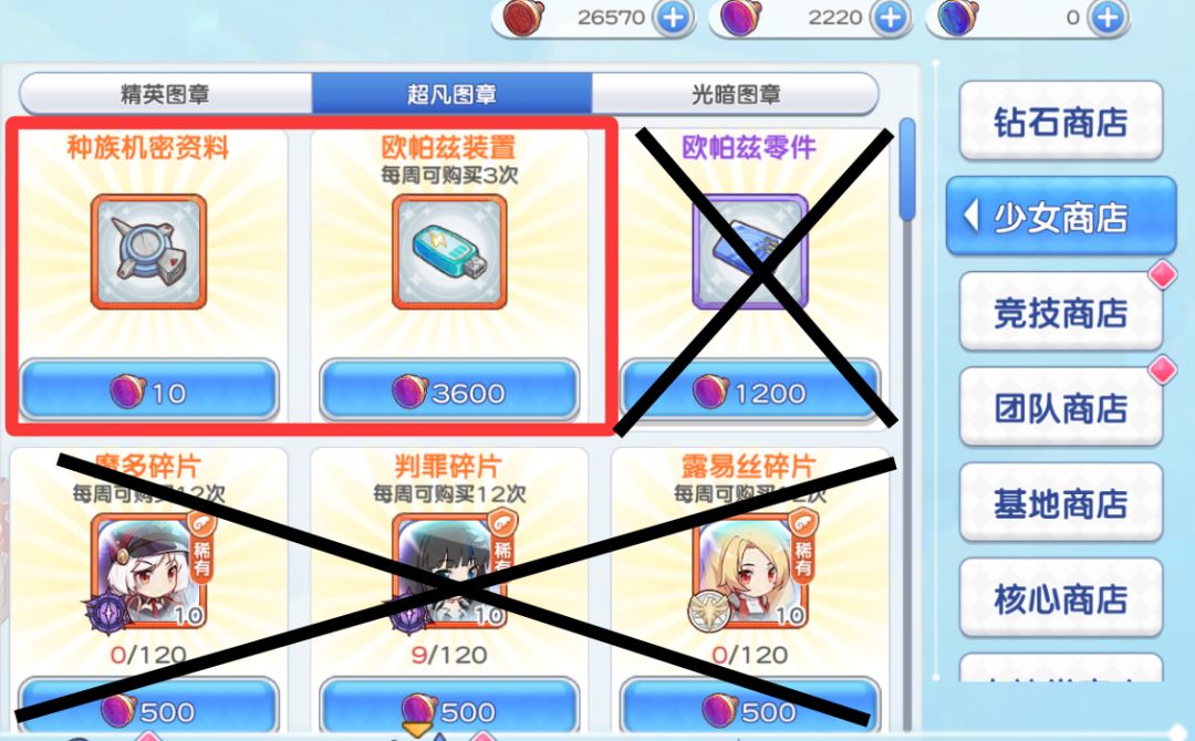 ②进化单元缺时就在这买,买稀有传说少女为主,传说少女碎片不买除非就差这几片。