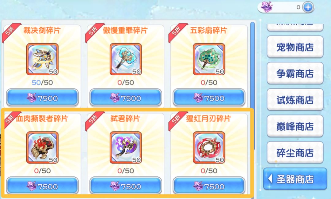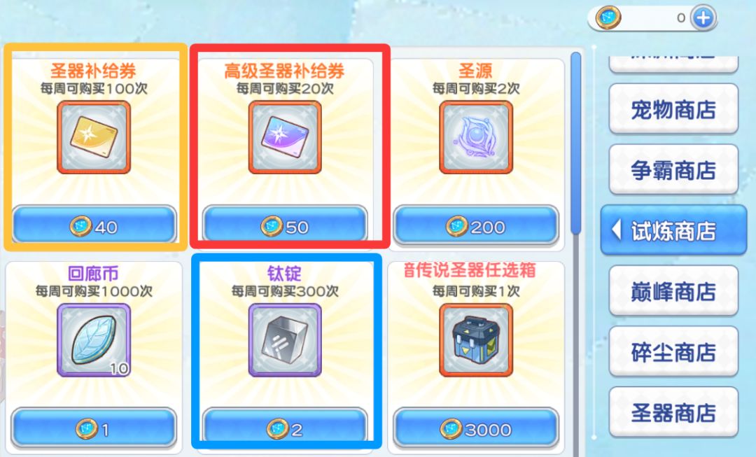 ②圣器票和四种石头缺的话等大活动不定时开的神秘商店买,四种石头实在等不及平时活动也会有打折的。