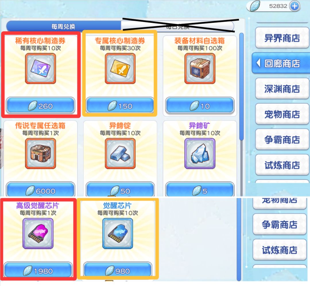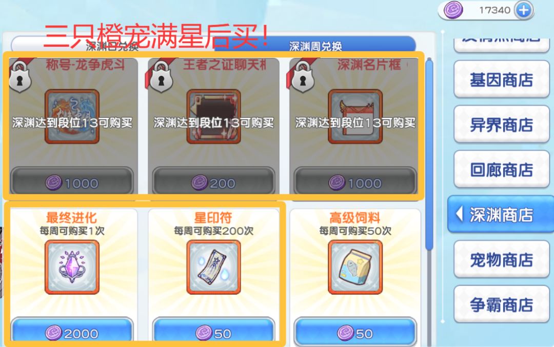③深渊周兑换在三个橙宠满星后买,优先最终进化最后才换星印符