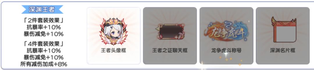 ④外观相关王者1段位以上开启,头像框任意赛季都行,若有永久头像框或者稳定王二,考虑pvp可以每周买一次(每周1折会刷新),深渊套装有属性加成。