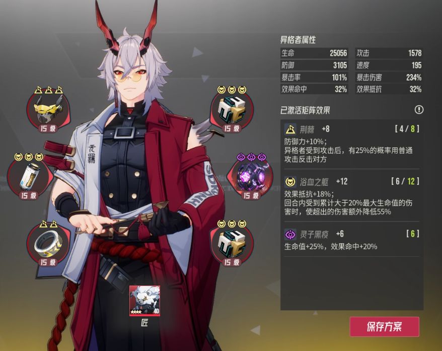 定位是常用的反核手,肉队打手,我这里带戍卫讯光胡狼,为了是限制一下对面控制队伍,肉队内战中,匠的强度是要大于胡狼的,胡狼赫同需要3000防御,70以上暴击,速度越快越好。