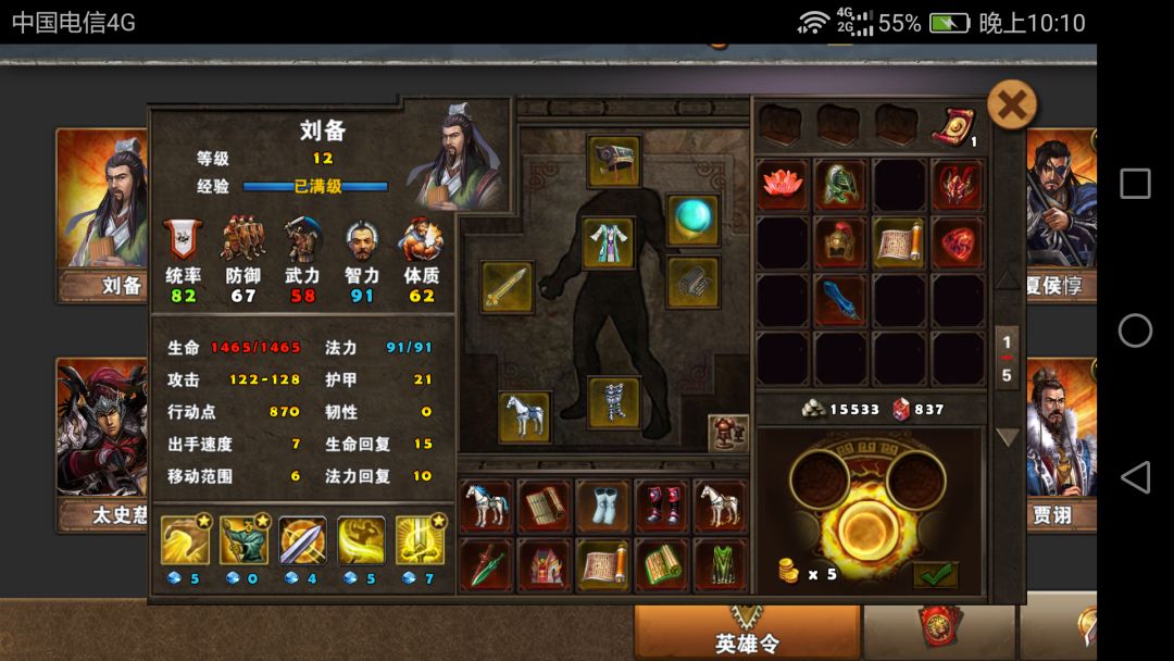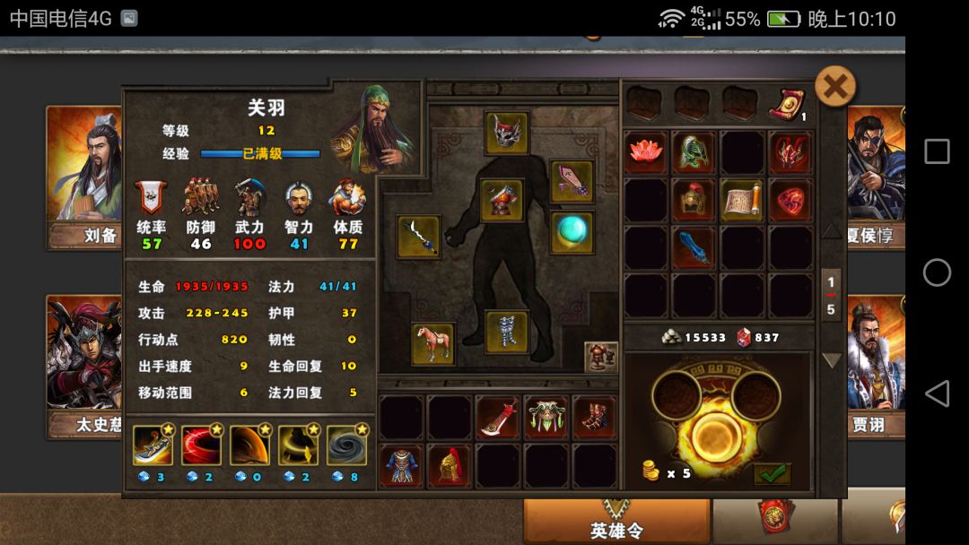进入推图,选择关羽后,一路打矿捡资源,这里把刘备的寒风下了,前面反而影响了自己。然后在休息时放上去,甚至加上双六韬。有个小技巧,就是隔天时可以放增加路程的道具,在战斗前换回来即可。若是需要回蓝又要长跑,那就先上回蓝装,过天,然后换长跑装,退回一天,再换上战斗装备。这样就可以回蓝长跑两不误了。就是要小心不要在过天时被攻击了,那样子欲哭无泪啊。