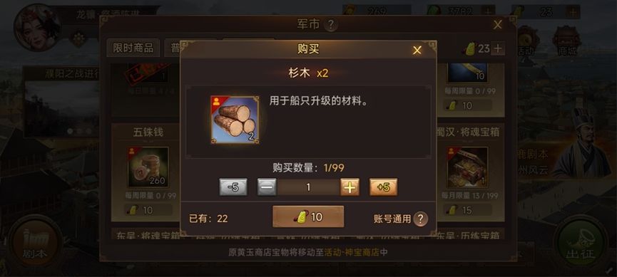 消耗“杉木”。获取方式包括,每周战役奖励、军市黄玉商店、活动商店的金玉商城、不定期活动商店。由于只有2艘奇珍阁战船需要升级,总需求也不高,建议通过每周战役奖励获取“杉木”即可。