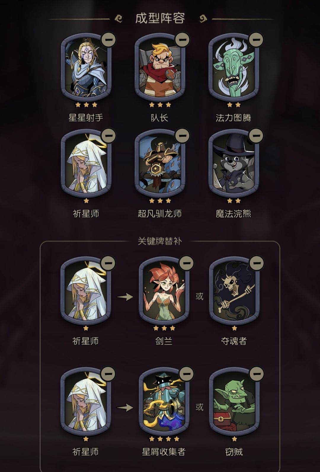 其他牌为叠阵营数量,加星星伤害次数,然后魔法浣熊快速升级