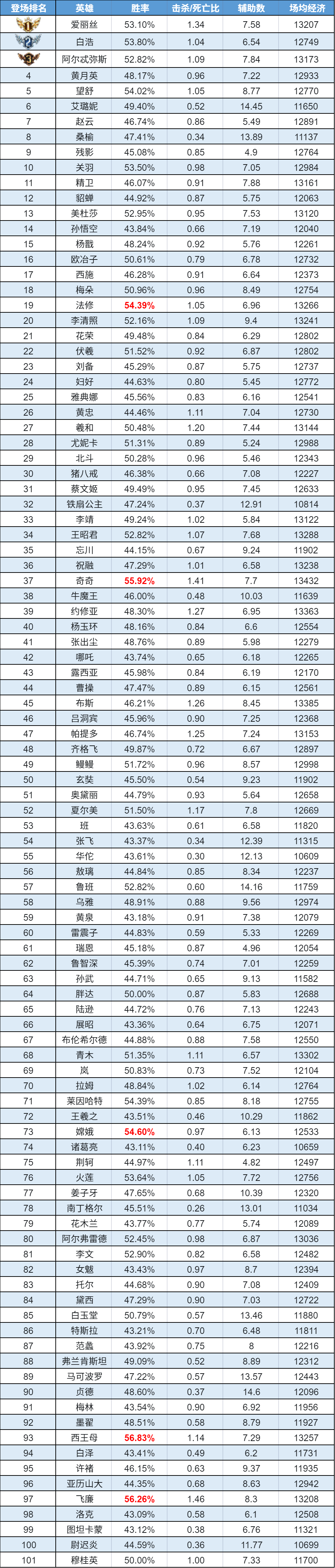 【低段位】爱丽丝人气强势回归,重登榜首,白浩热度有所下滑;西王母展现稳定统治力,连续两周胜率第一;奇奇成为场均经济TOP1。