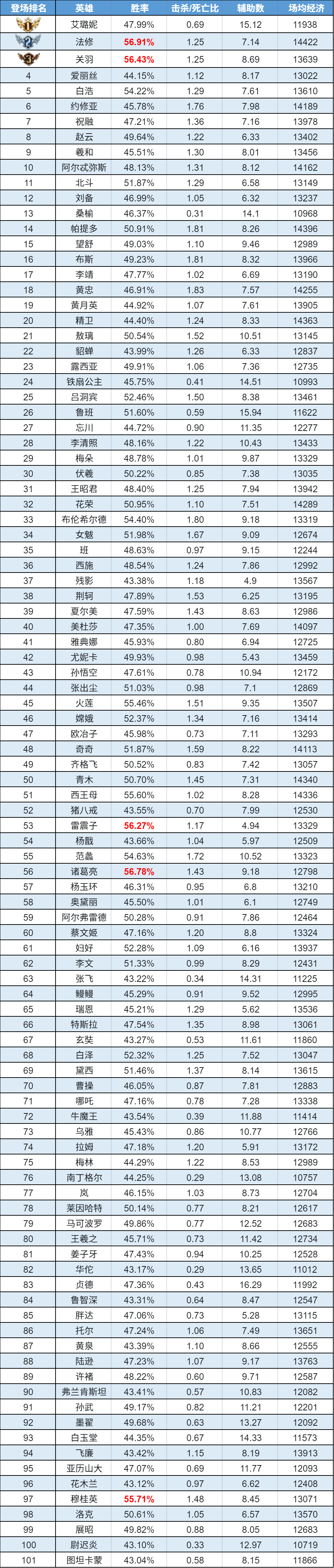 【高段位】法修人气跃升至第二,关羽受重做影响,热度飞升至TOP3,胜率同步挺进前三;法修蝉联两周场均经济之王。