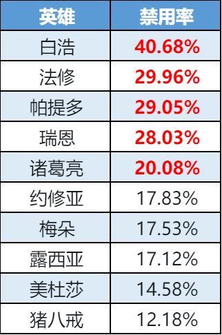 禁用率榜-诸葛亮回归前五,猪八戒上榜