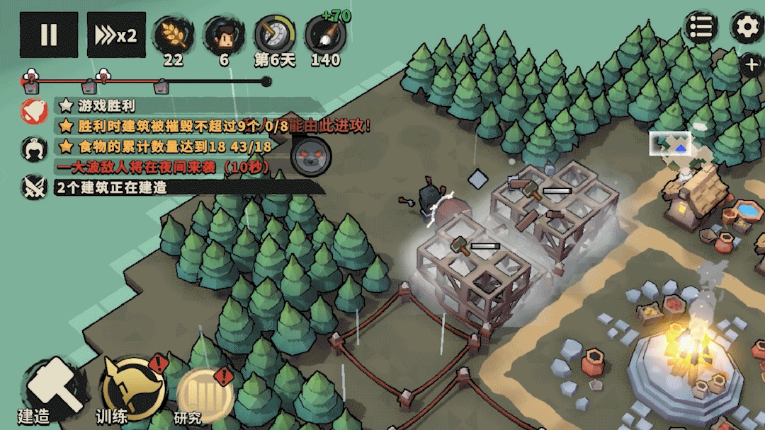 作为守城人,学会“资源管理”十分重要!敌人来袭前抓紧建设农田、民宅、伐木场等建筑,快速组建一批守城部队,抵御住敌人第一波进攻,为城镇的长期发展赢得宝贵时间。
