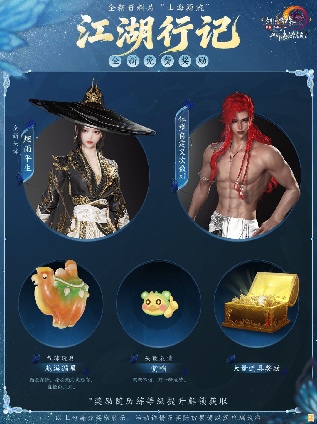 行游千里,厚礼盈怀,新一期江湖行记带来丰富的精彩奖励,免费版奖励包含全新头饰,路途迢遥无畏风雨,且行且歌快意平生!还有体型自定义次数、气球玩具和头顶表情等奖励可获取!
