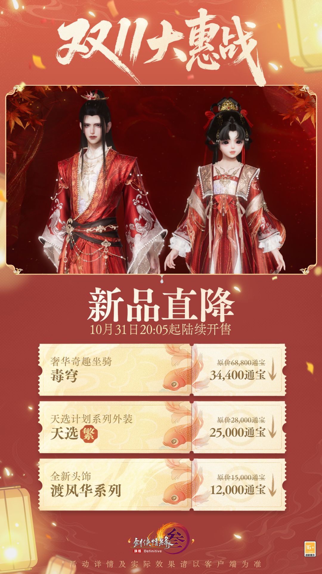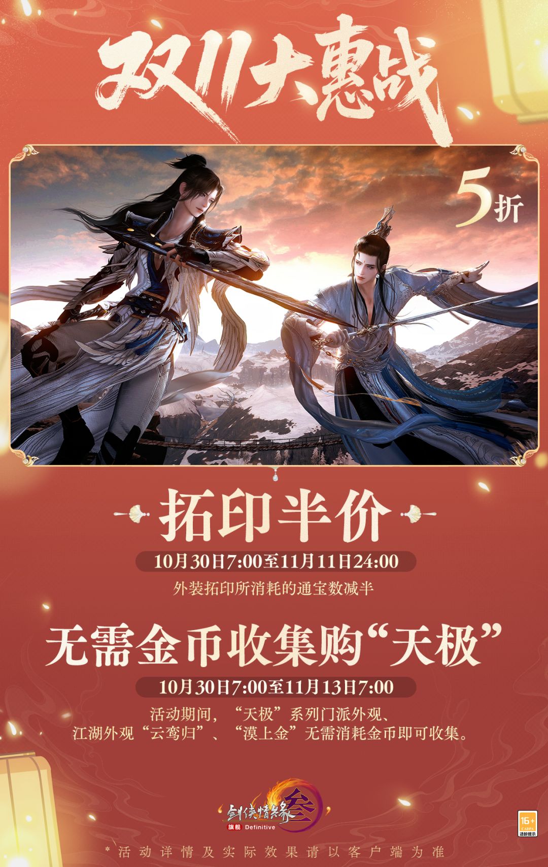《剑网3》双11大惠战活动将于10月30日先行开启!不玩套路,系列新品价格直降,消费还有好礼相赠!6倍积分回馈、拓印5折、NPC计划系列外装折扣返场、商城成衣9折、小玩意儿与家园专区等诸多折扣助力双11大惠战!