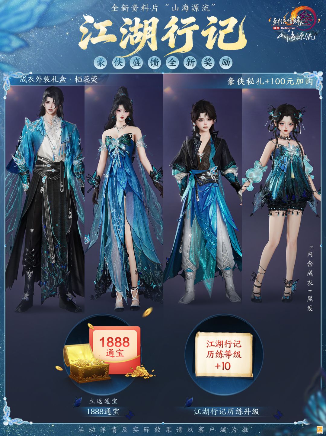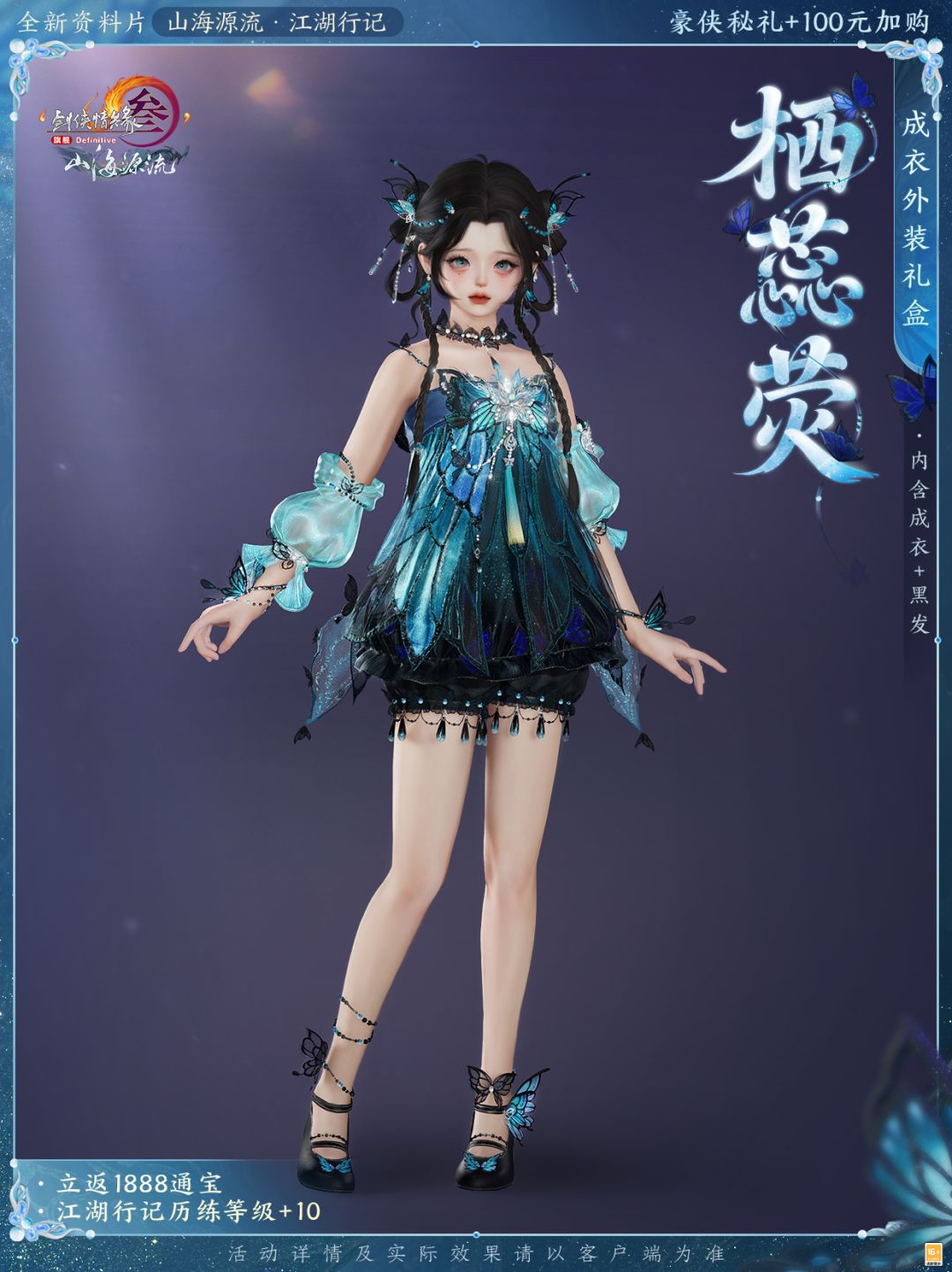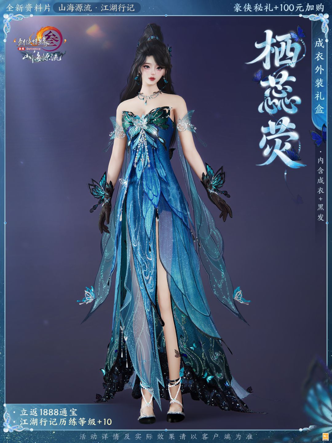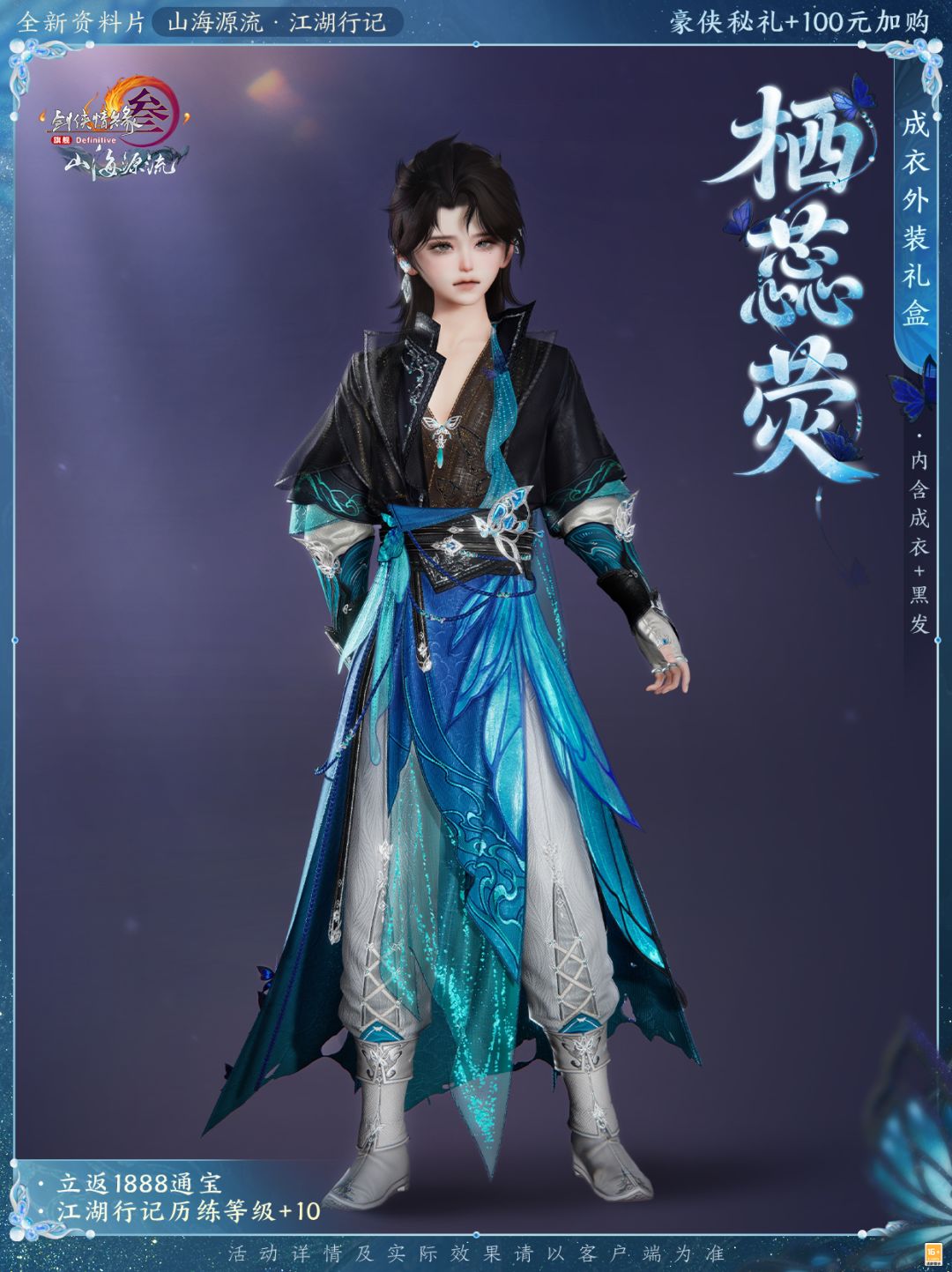 在解锁豪侠秘礼的基础上,侠士可再100元加购成衣外装礼盒“栖蕊荧”,立返1888通宝的同时直接提升历练等级!成衣外装礼盒“栖蕊荧”将蝶饰缀入衣装,细碎荧光如夜露映星,编织幽夜华美舞步,神秘翩跹。