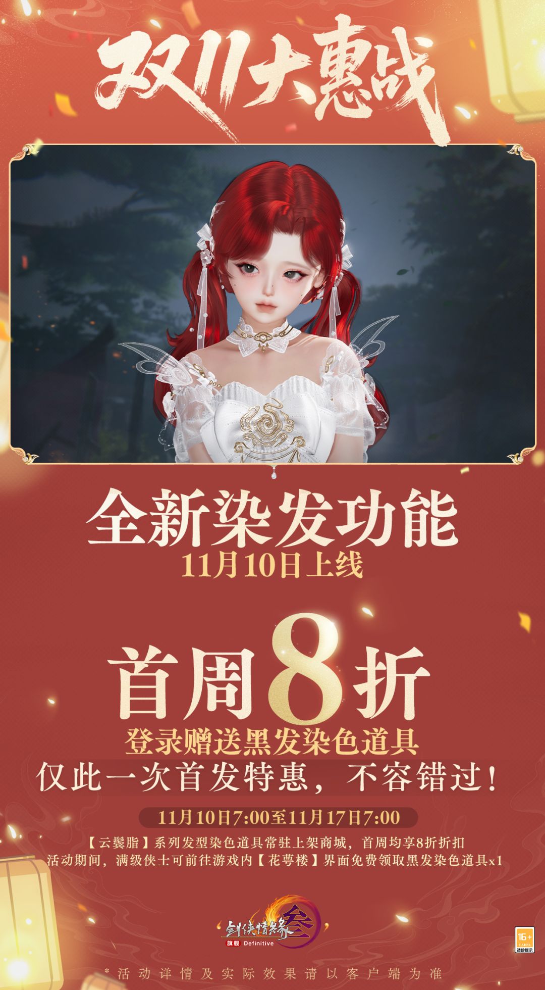 全新染发功能则将于11月10日上线,登录即送黑发染色道具,首周染发均享8折折扣,仅此一次首发特惠,不容错过!