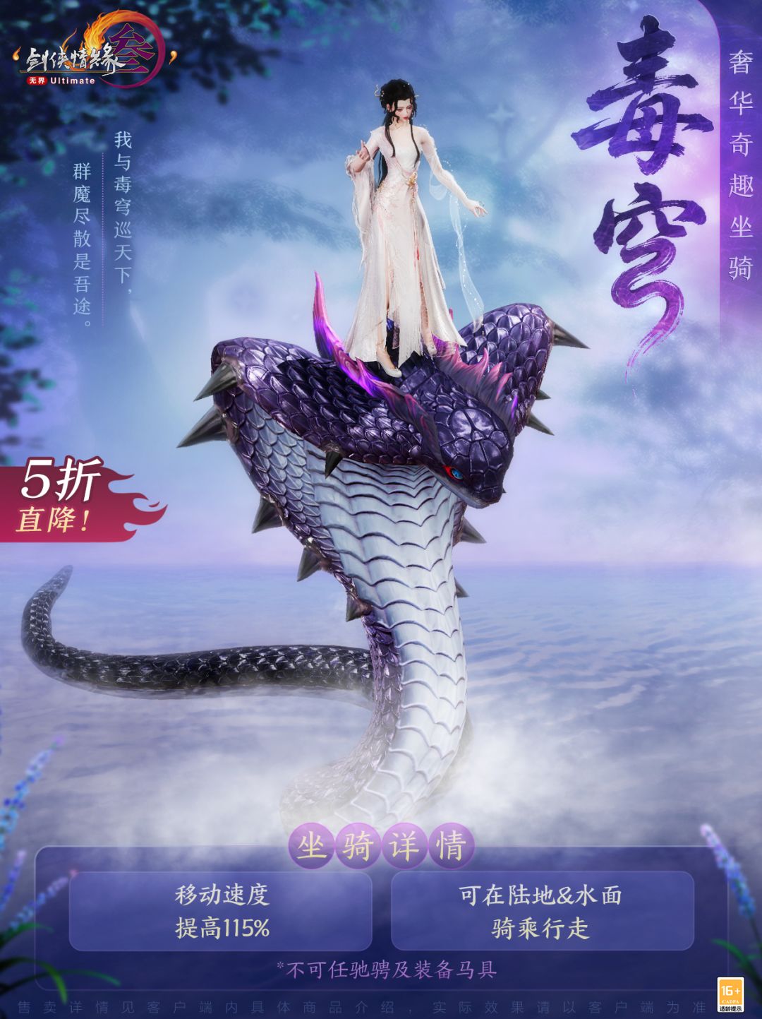 我与毒穹巡天下,群魔尽散是吾途。奢华奇趣坐骑“毒穹”深紫鳞甲如淬暗夜流光,身姿巨大却灵动自如,穿林破雾,尽显珍奇异兽独有的神秘威慑!