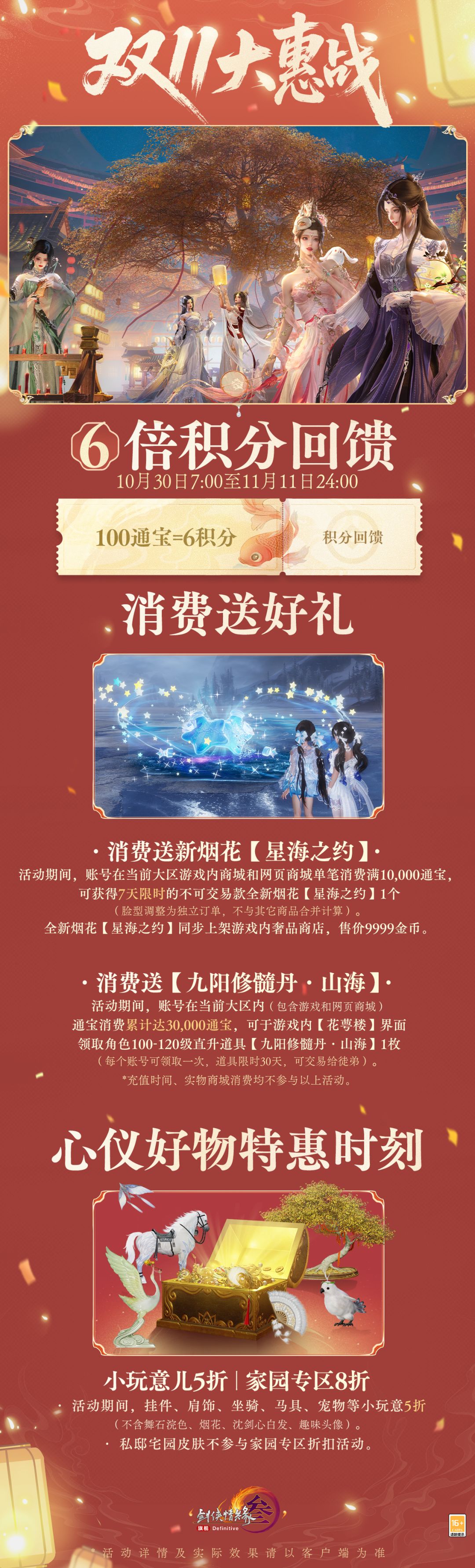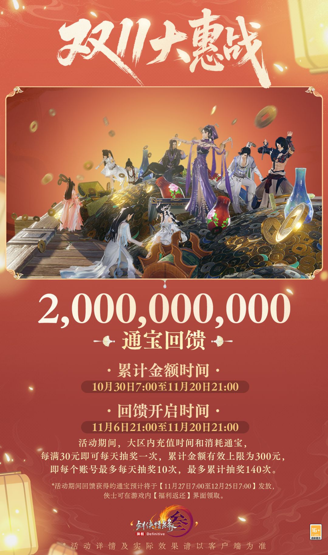 *其中,通宝回馈翻牌活动将于11月6日21:00开启,但侠士在10月30日7:00至11月20日21:00期间的消费均将记录可翻牌的次数,还请侠士留意。