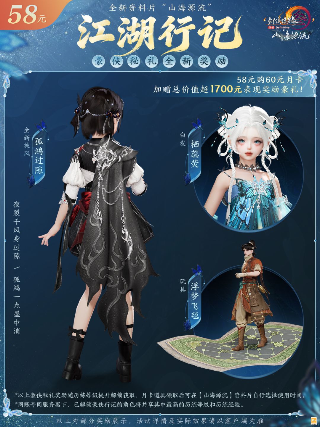 孤鸿一点墨中消,全新披风“孤鸿过隙”以一袭玄黑半身披风斜覆,不掩利落身手,暗蓄利落洒脱之游侠气度,定制白发“栖蕊荧”蝶翼点缀尽显轻灵梦幻。