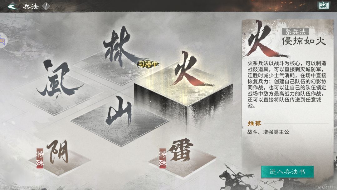 兵法一共分为风、火、山、林、雷、阴6个系,其中雷、阴为特殊兵法,雷系兵法需要担任国家官职后才能使用,阴系兵法需要消耗道具才能使用。剩余的风、火、山、林,四大系,使用兵法技能点加点后即可使用,也是我们这次介绍的重点。