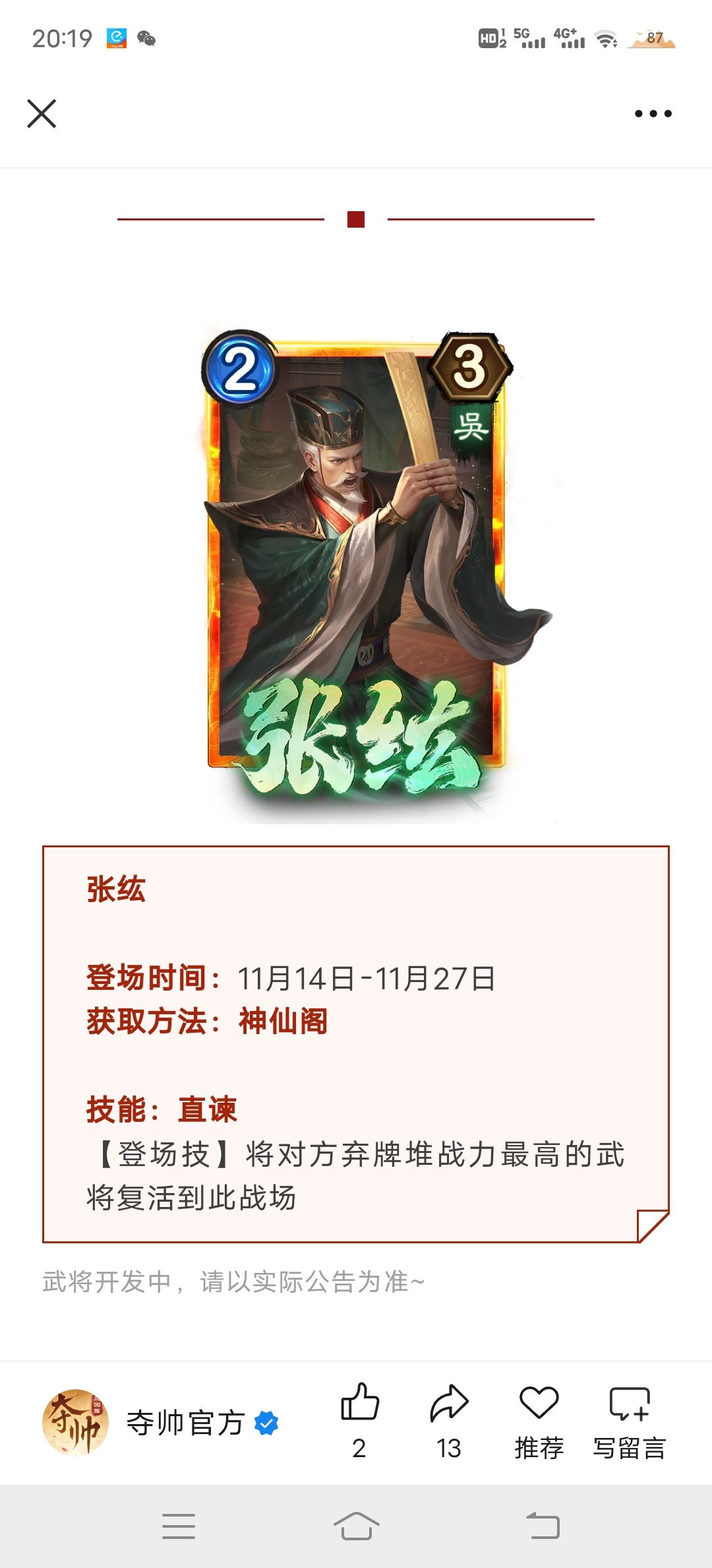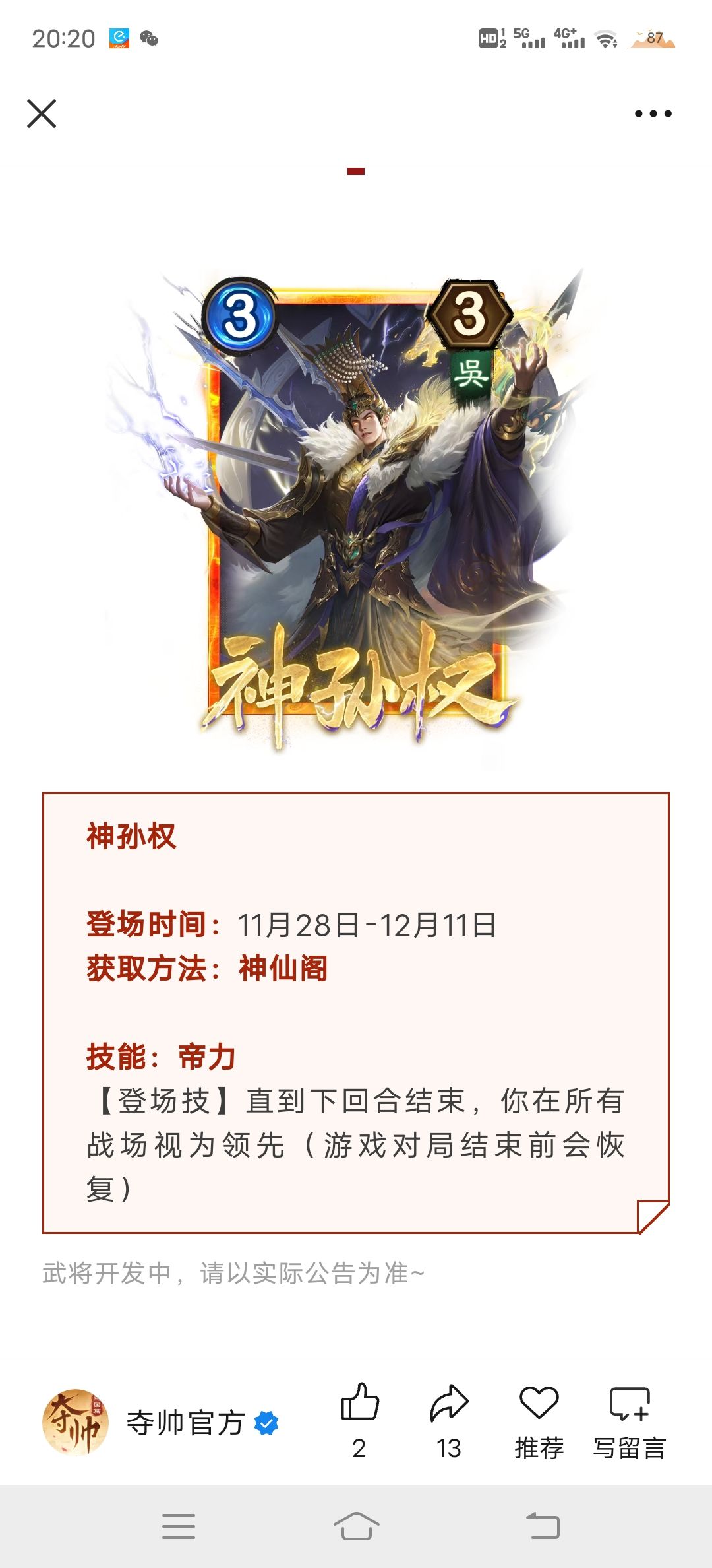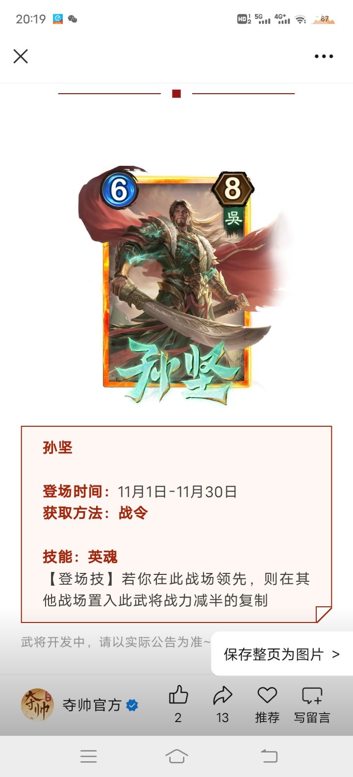 晃子又加强,破坏补强。移动很爽,如果复制的话,两个能不能移来移去。。连环竟然有补强没想到。神张角被单防了,孙坚孙权这个又是未来可期,,领先加分就一个周瑜,孙坚68外加两个44呗。配刘焉我觉得可以。