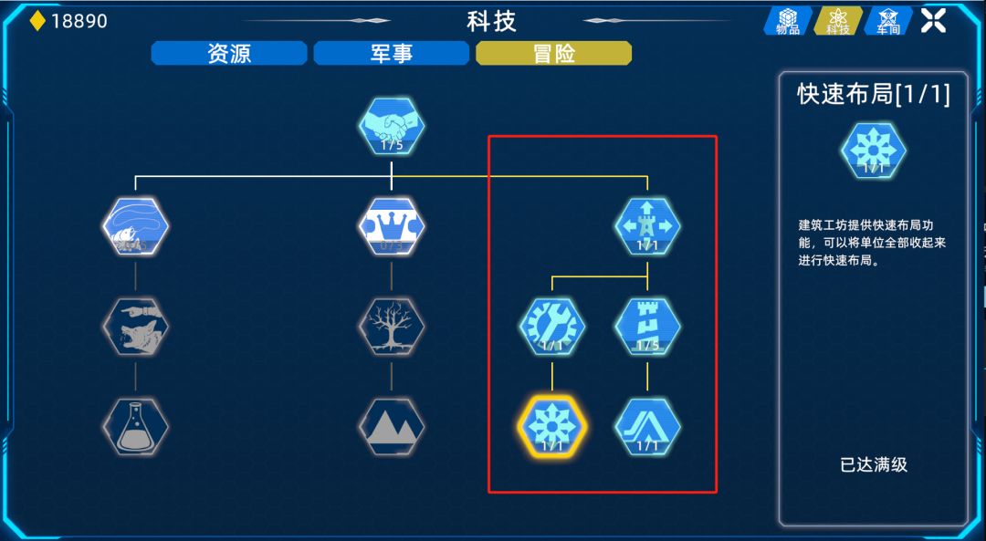 4、批量布局已有建筑:升级科技【快速布局】后可在Boss关卡前的战争工厂里批量快速布局建筑。