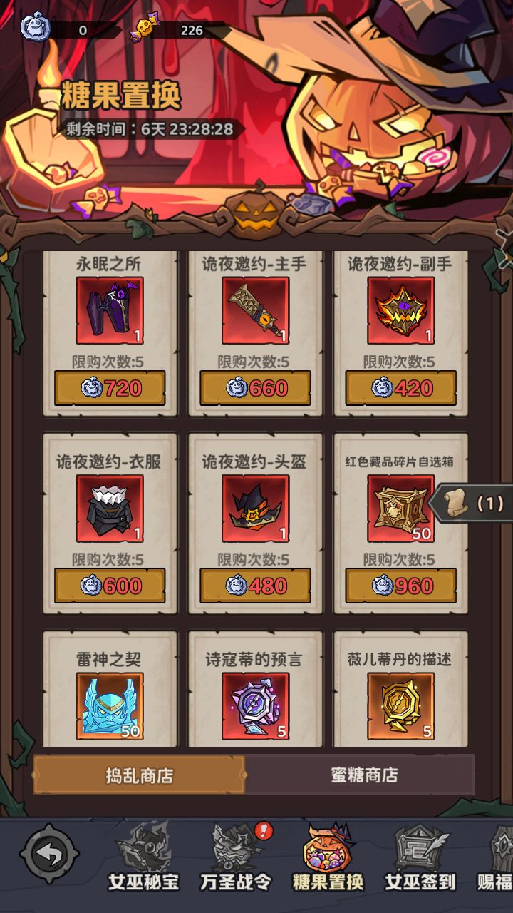 女巫秘宝可理解为,用价值50钻一个的南瓜,抽两种兑换材料的活动。两种材料诡灵糖果和诡灵币分别有自己的兑换商店。