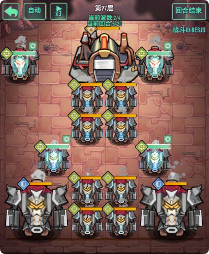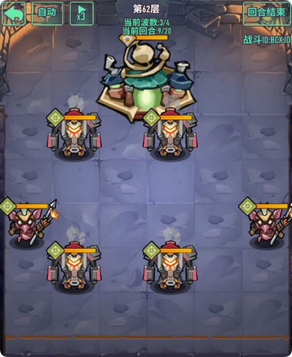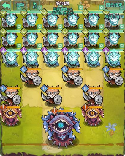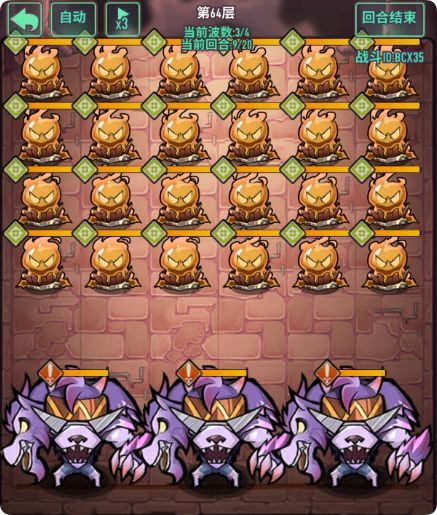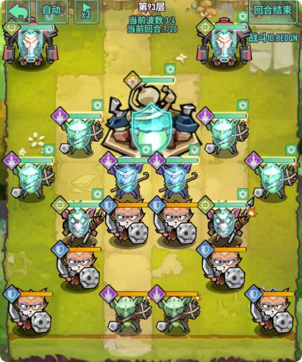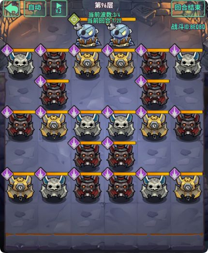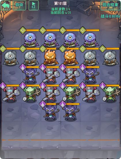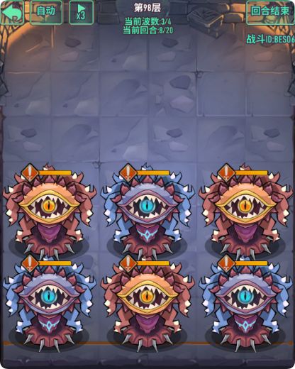 - 注意点:怪物数量多,有加攻击哥布林需要优先清楚,前排4只冲锋甲虫具有高额四维,清怪同时需要计算好血量,回合结束变更位置时,可以保留前排阻挡怪,减伤伤害