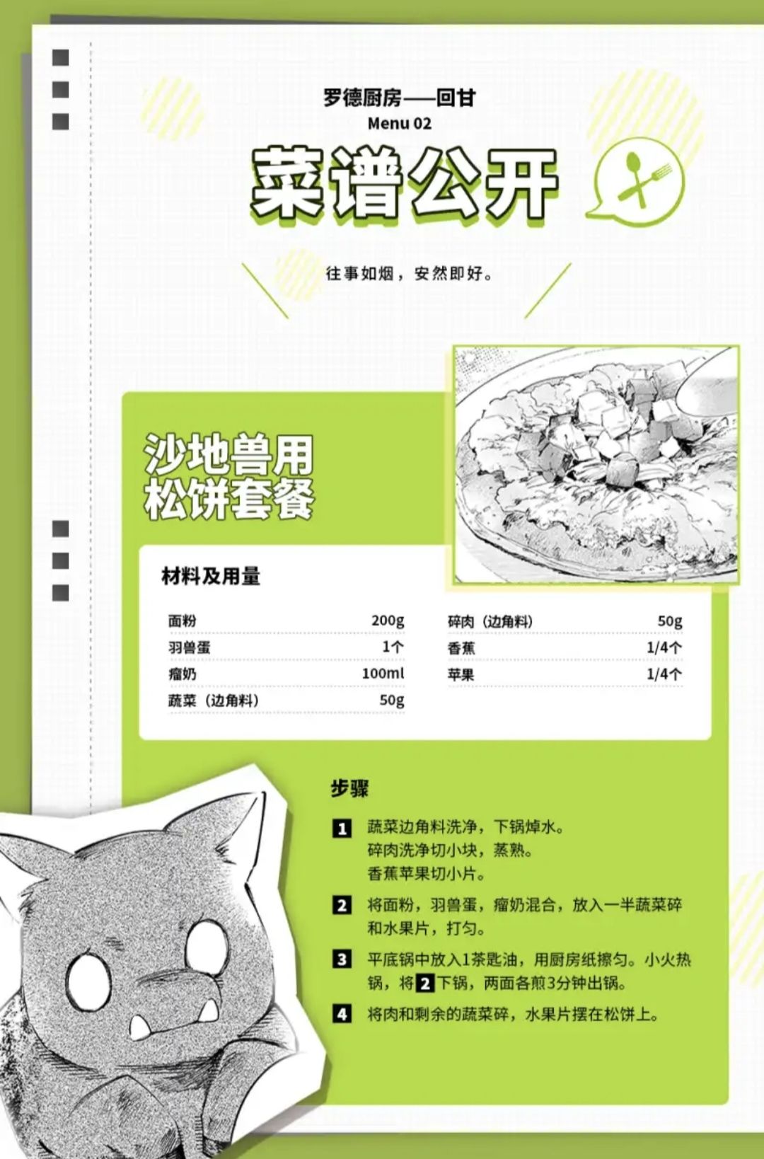 在罗德岛食堂,角峰掌勺的日子永远最让人期待。清晨时分,他做的松饼卷声名远扬,连患有矿石病的孩子都会特意早起排队。只是他粗犷的模样,偶尔会吓到胆小的孩子。曾有名叫亚克的孩子,为了自己的沙地兽多拿了一块松饼卷,因此受到角峰的训斥 —— 这并非不近人情,恰恰是他细心的体现。他从孩子们的闲聊中得知,沙地兽无法食用高盐高糖这类乳制品,便一直记在心上。而他向孩子道歉的方式也很特别:一份为沙地兽特制的蔬菜松饼卷,便是最妥帖的补偿。