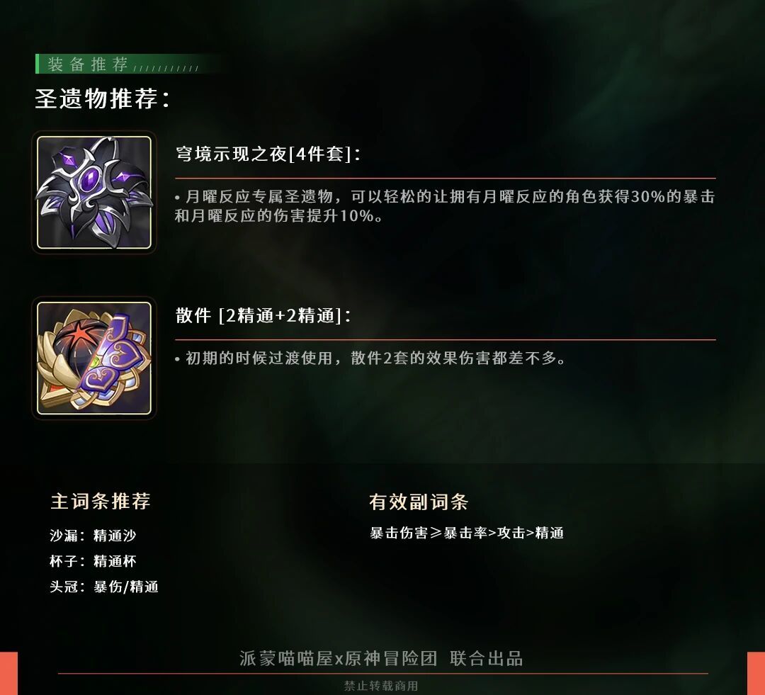 固有天赋1效果:月兆满辉释放战技时,将场上的草原核和丰壤之核转为无法迸发的诳言之核,奈芙尔释放重击幻戏会吸收周围的诳言之核,最多吸收三颗获得三层「伪秘之帷」,使幻戏获得1.24倍的独立乘区并提升100精通