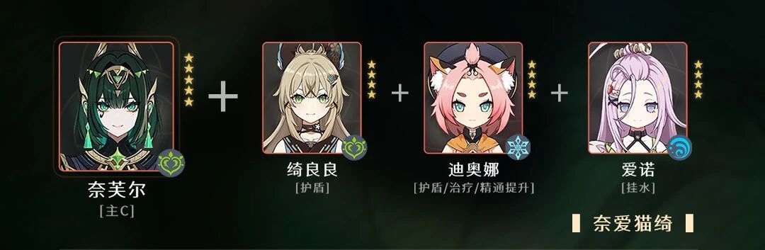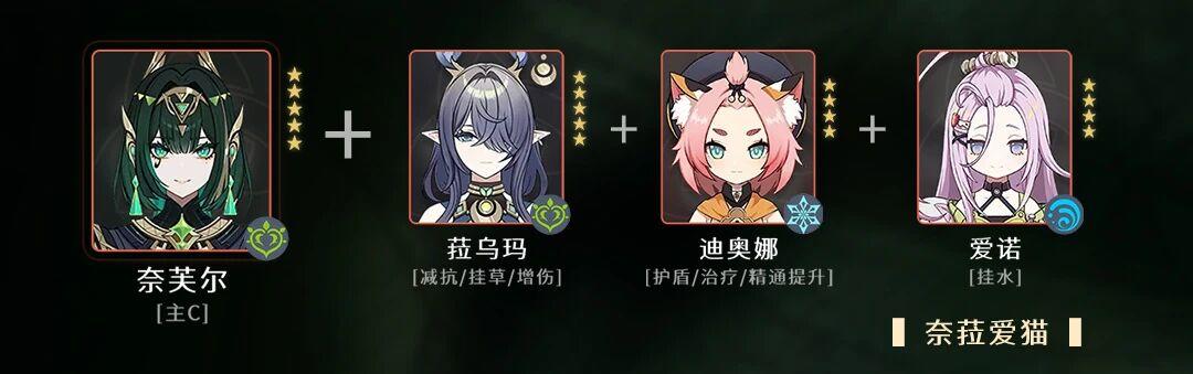 6.1奈菈爱猫推荐理由奈芙尔与菈乌玛组成满辉阵容,菈乌玛带草套加上自身战技能大幅减少敌人抗性,大招增加月绽放的伤害;爱诺能够提供脱手的后台水,带纺夜套增加精通;猫猫能够提供护盾和治疗提供生存的同时,满命还能额外提供200精通