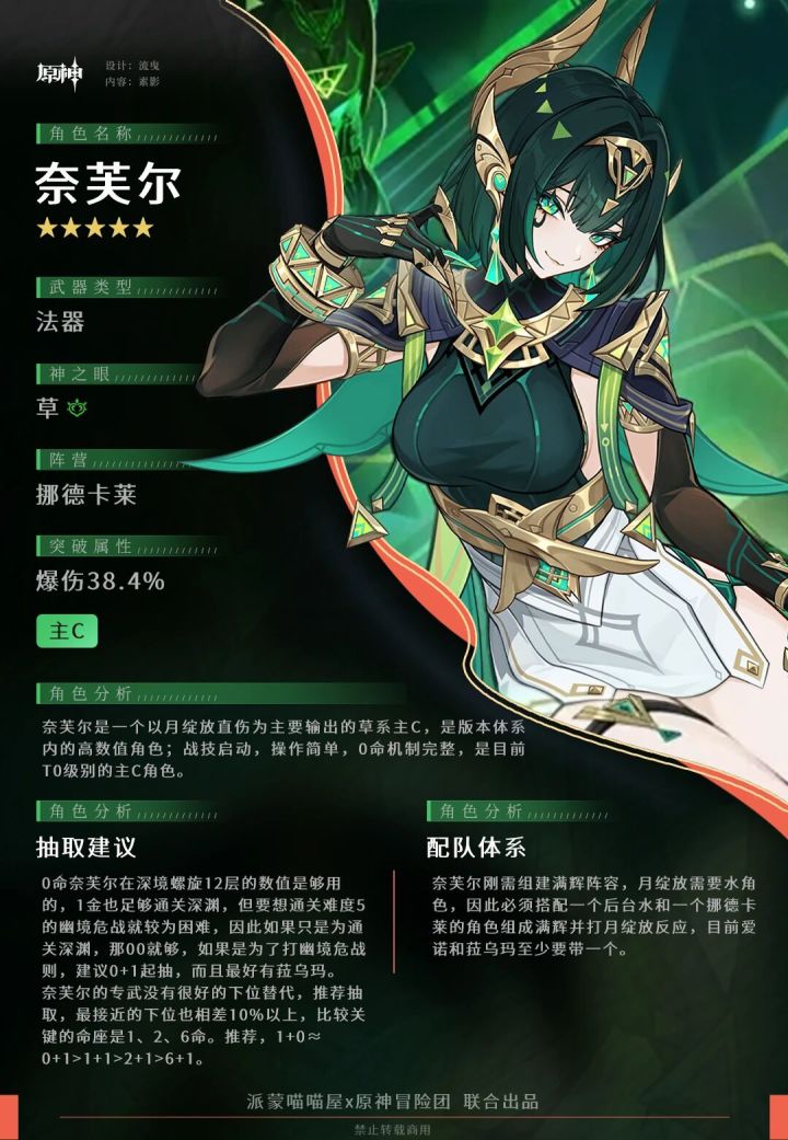 奈芙尔绝对是一个值得培养的主C,鉴于目前已有的两个月曜反应中,月感电伤害是可以通过反应打出来的,但月绽放伤害只有直伤,完整的月绽放队伍才能走机制,月感电带上伊涅芙就可以走机制了,所以更推荐组建完整的月绽放队伍的