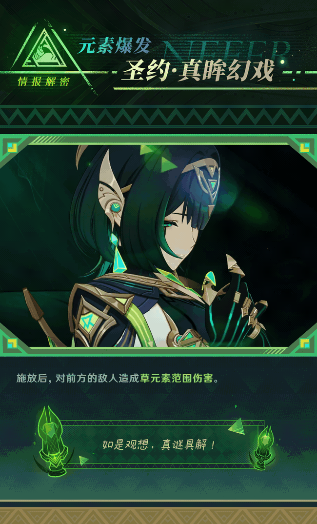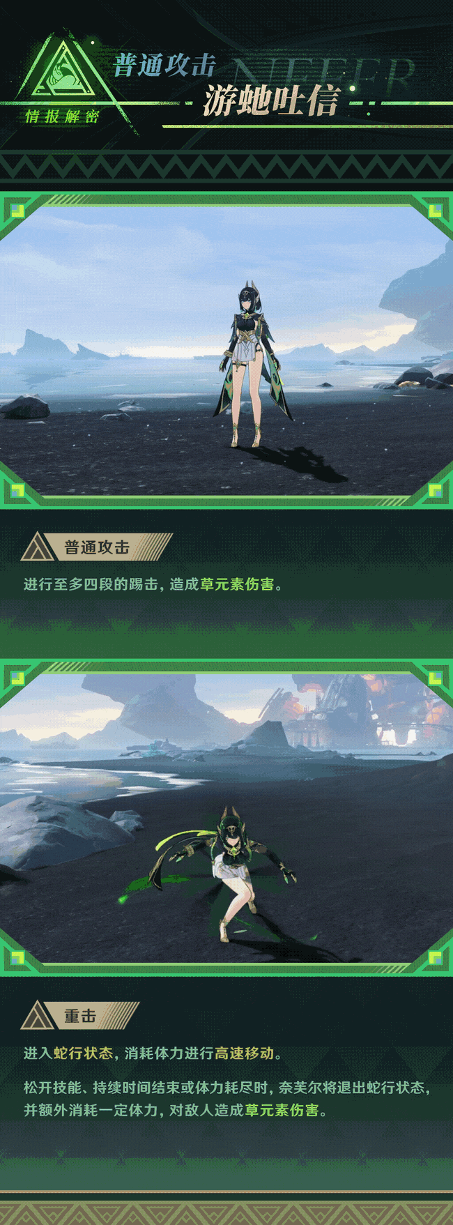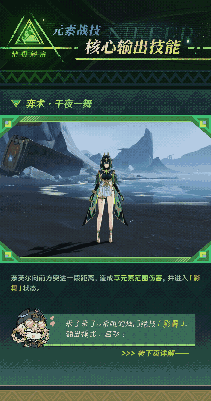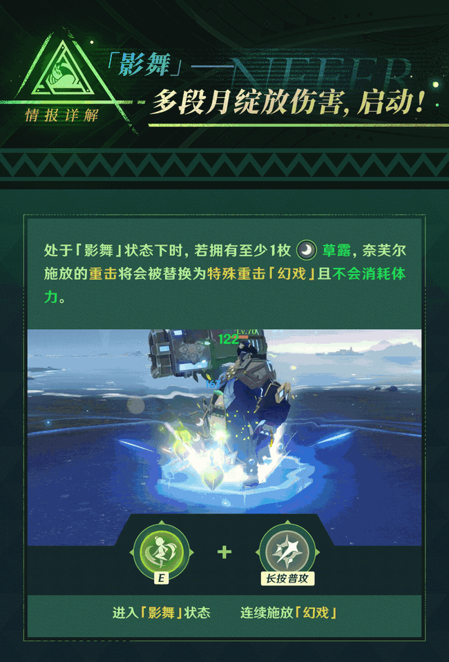 [元素战技E]效果:释放战技进入影舞状态,提高奈芙尔的抗打断能力,消耗草露可以将重击转换为不消化体力的特殊重击幻戏