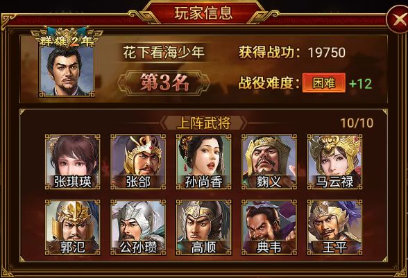 花下看海少年 同样以 19750 的战功攻破 困难+12,赢得Top3席位!