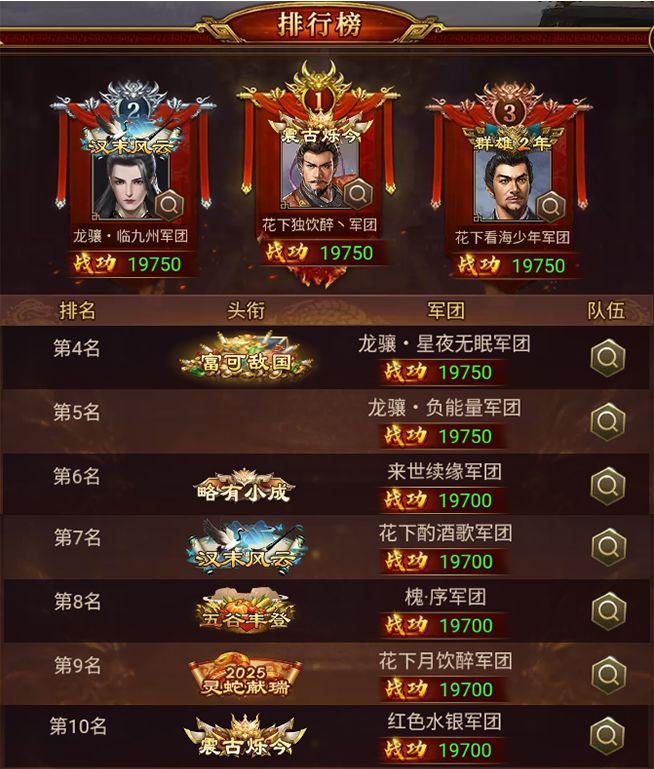 荣登本期汉中之战榜首的是 花下独饮醉丶 军团,以 19750 的战功创下汉中之战新高度!赢得第一的宝座!