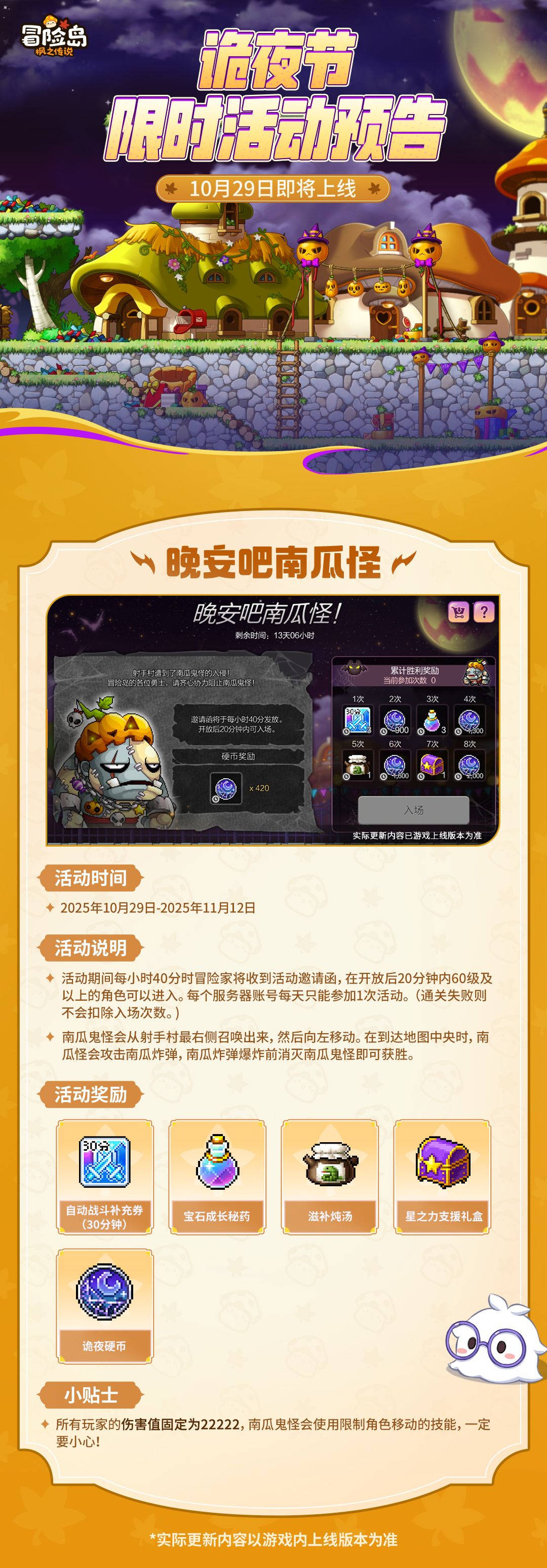 活动邀请函即将送达各位冒险家手中,打败突然出现在岛上的南瓜怪就有丰厚的奖励哦~请冒险家们准时抵达!