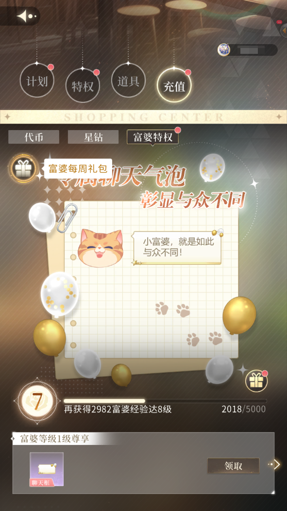 达到任意档位富婆等级,可在富婆特权中领取每周奖励!快来领取喵~