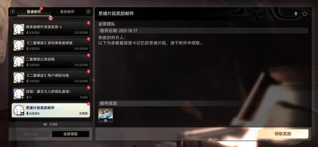 (邮件奖励领取界面)