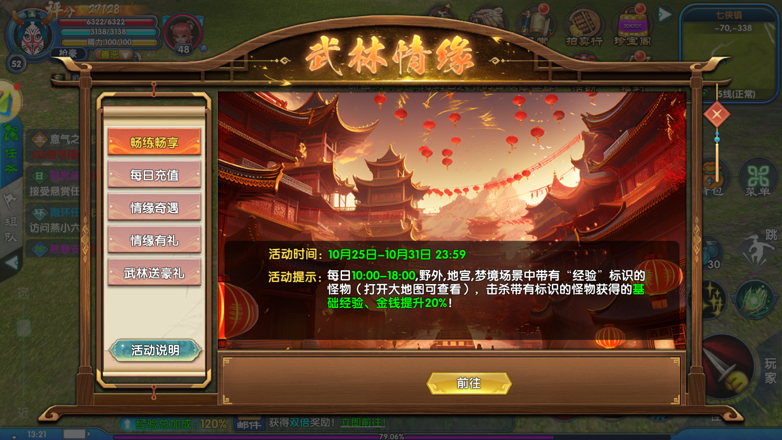 - 活动内容:野外、地宫、梦境场景中,带有 “经验” 标识的怪物(打开大地图可查看位置),击杀后获得的基础经验、基础金钱提升 20% ;