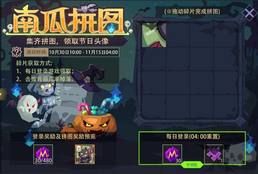 活动内容:活动期间,每日登录游戏可领取魔晶及随机拼图碎片奖励。另外,在(冒险模式/冒险试炼场/梦魇模式)下击败首领也有几率掉落拼图碎片。集齐所有拼图碎片并拼凑完整,还可以获得限定头像“小恶魔”。