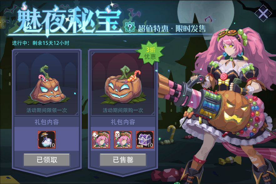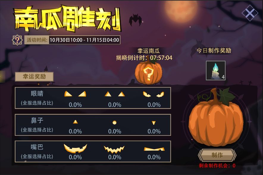 活动内容:活动期间,消耗“幽暗蜡烛”来点亮南瓜灯,每次能获得随机奖励,并有概率获得所选大奖。每一轮开始时可自选一项大奖,每10轮游戏还可以自选更丰厚的终极大奖。