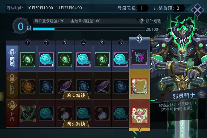 活动内容:活动期间,每日登录或击杀首领可获得经验;提升徽记等级。免费徽记默认开放,传奇徽记和上古徽记需购买解锁。徽记达到对应的等级,可领取对应档位的奖励。免费徽记可获得“勇士英魂”、“次元碎片”、“随机英雄”等好礼;传奇徽记可获得“传奇英魂”、“次元碎片”、“神祗碎片”、“限定动态头像框[萌鬼之夜]”等好礼;上古徽记可获得“幻彩之尘”、“英雄[不朽守护者]的专属皮肤[邪灵骑士]”以及专属头像[邪灵骑士(闪)]等豪礼。