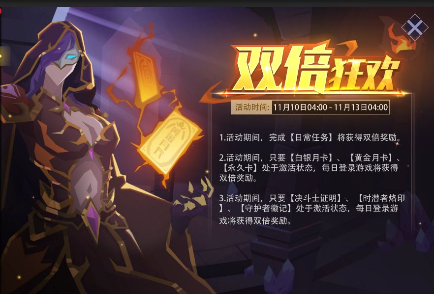 (3)特权卡双倍馈赠!活动期间,当【决斗士证明】、【时潜者烙印】、【守护者徽记】处于激活状态时,每日登录游戏,即可获取双倍奖励,为您的游戏之旅增添更多助力。