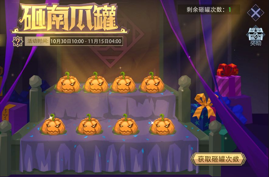 活动内容:活动期间,完成每日任务可获取砸罐次数;每日最多获得4次机会。随机将8种奖励放入南瓜罐;每次会消耗一次砸罐次数并获得其中奖励。点击“奖励图标”可以查看奖励图鉴及当天已领奖励。次日04:00重置所有南瓜罐,并清空上一天的图鉴进度和剩余次数。