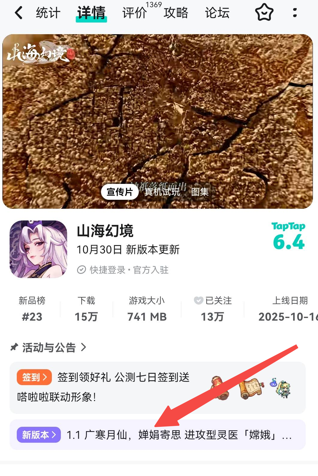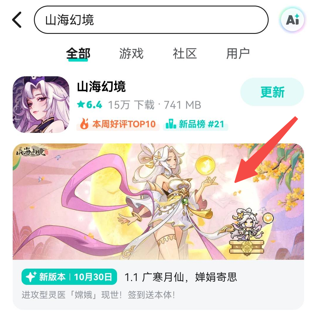 方式1:在TapTap中搜索《山海幻境》,游戏下方即有新版本展示页,点击即可进入。