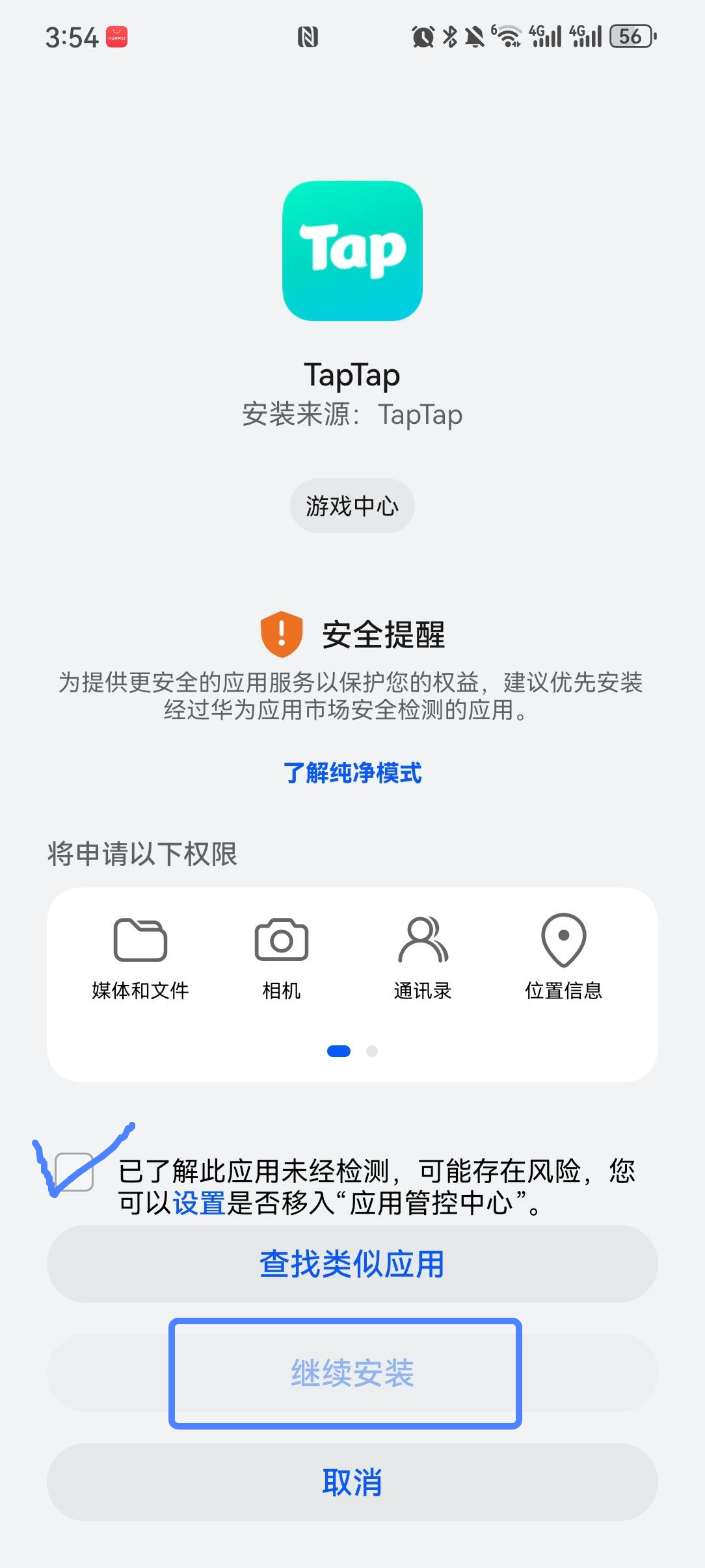 步骤四:部分机型可能会遇到安全提醒检测,这一步可以直接勾选【已了解】并继续安装哦~