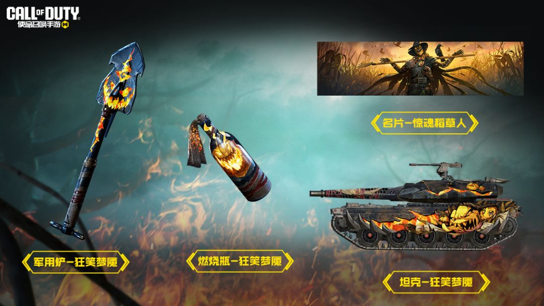 在本次派对恶魔活动中,还有军用铲-狂笑梦魇、燃烧瓶-狂笑梦魇、坦克-狂笑梦魇、名片-惊魂稻草人等奖励即将与战士们见面,共同在万圣奇趣之夜燃爆战场!