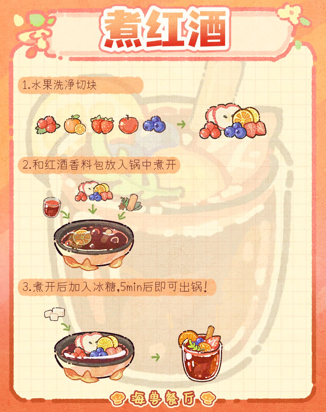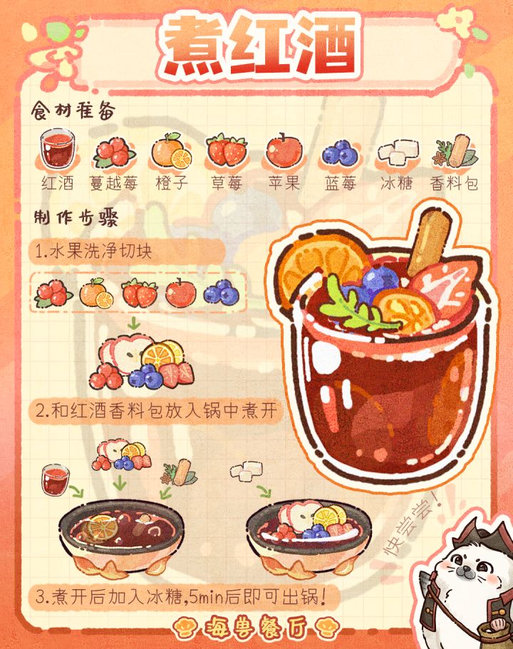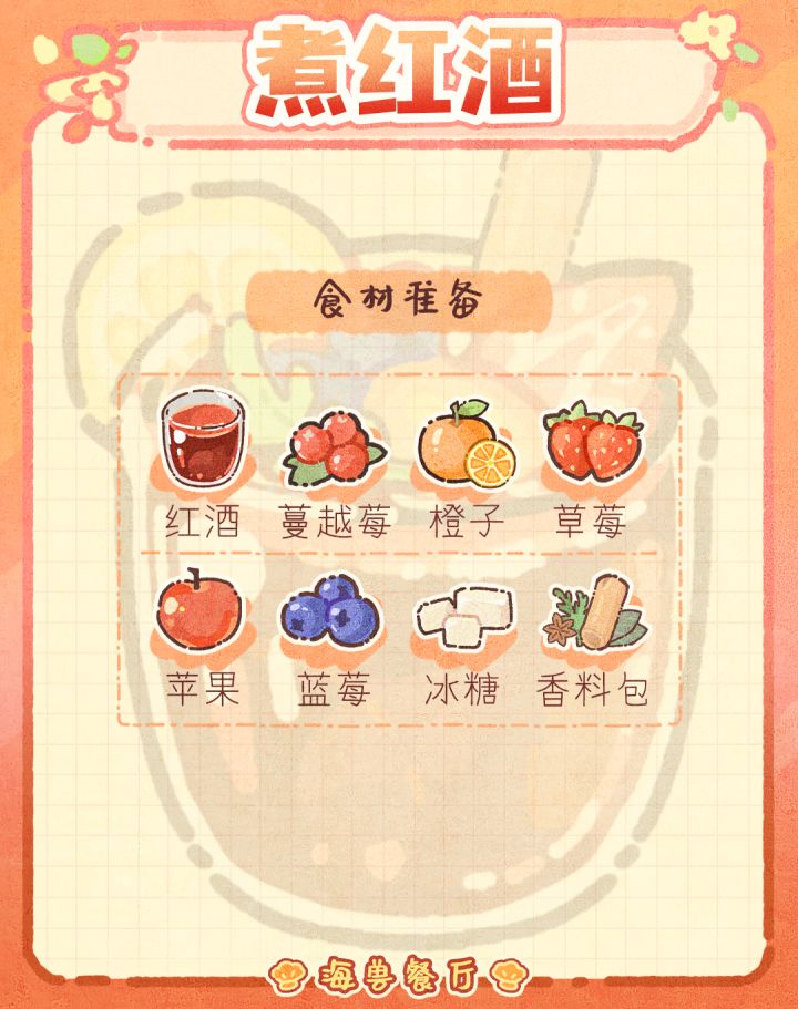 这样煮出来的红酒果香为很浓郁,一点也不涩口~转凉了,这个季节回到家中给自己煮杯热红酒暖心又惬意~🔍模拟经营手游《海兽餐厅》TapTap预约已开启,期待与你的相遇!