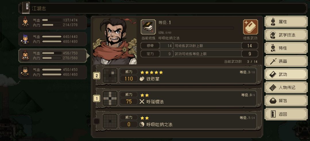 上官楠的呼延棍法满级后,学呼吸吐纳之法,点击人物肖像下的数字图标3,图标消失。