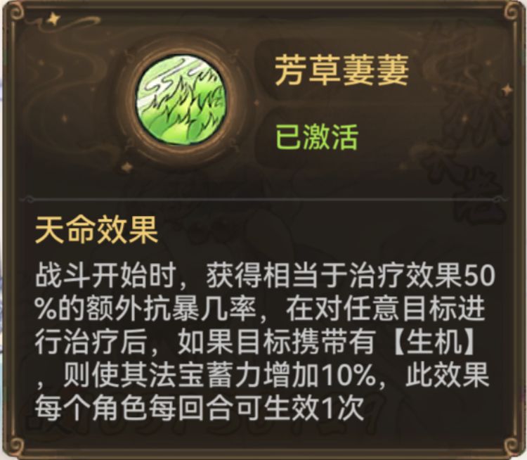 被动都是加治疗效果,单纯的加数值。二技能分为两个效果:提供一回合免疫与治疗队友提供额外生命。而三技能会给实时额外抵抗与防法宝复活队友。