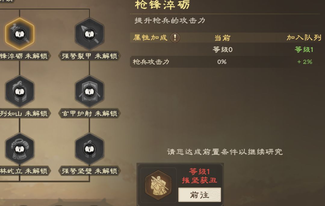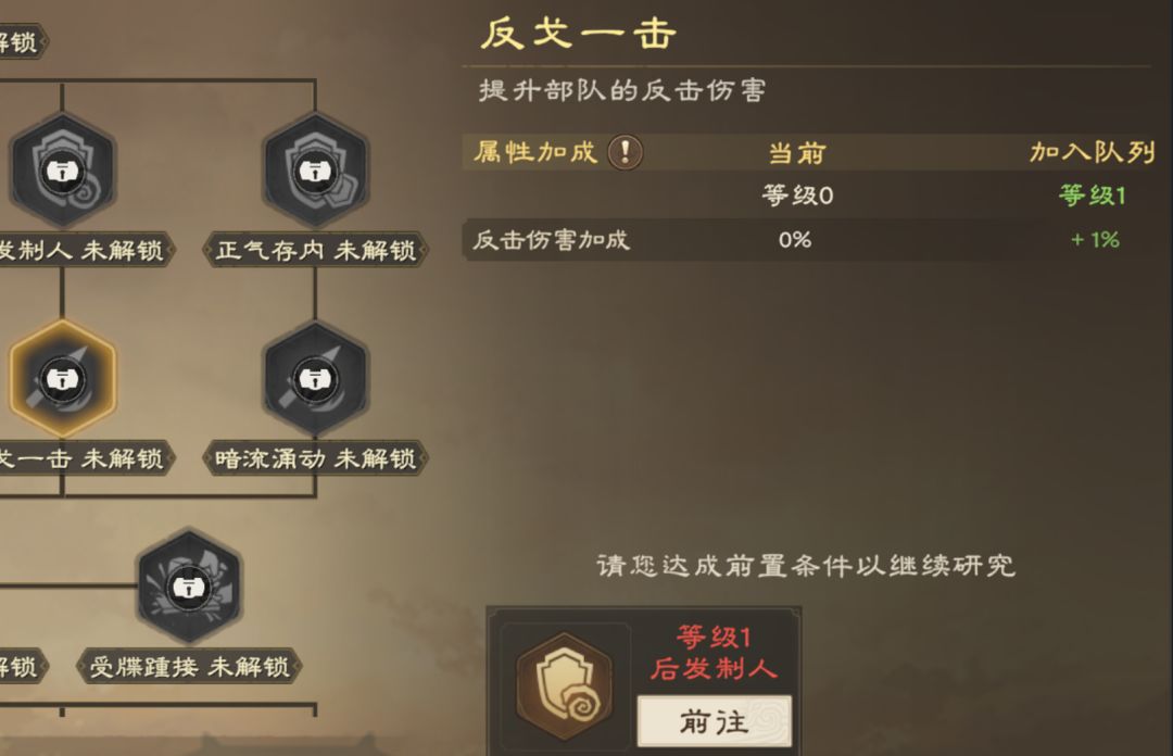 同理,每个军策节点研究均需要达成前置条件,类似科技系统。