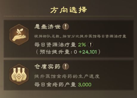 阿武提示:此处一般推荐大R不缺资源的前提下选择悬壶济世,因为其治疗量超过金疮药产量,能每日治疗更多伤兵。而平***择仓禀实药,可直接虚空产出更多金疮药,比起悬壶济世可节省资源。