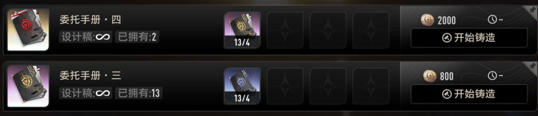委托手册一共有绿/蓝/紫/金四种,分别能额外获得1/2/8/20倍的收益。在铸造界面,我们可以使用4张同等级的委托手册和少量金币来合成更高一级的多倍券。显然我们可以看到,绿合蓝会亏一半的收益,紫合金会亏3/8的收益,只有蓝合紫是值得合成的!